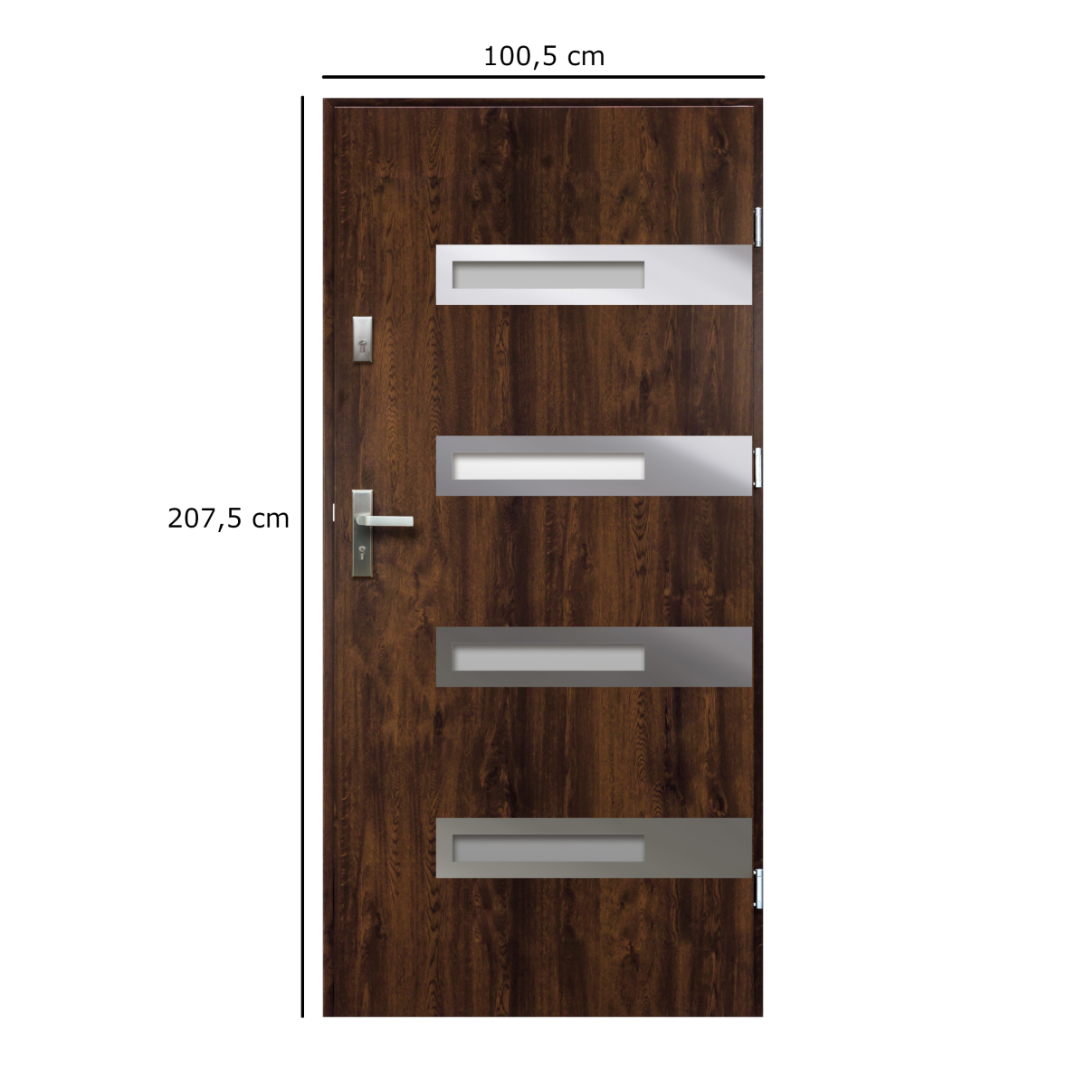 A homokfúvott üvegbetétek modern stílust adnak, miközben fényt engednek a belső térbe. Az 55 mm vastag ajtószárny préselt acéllemezből készült, amelyhez expandált polisztirol szigetelés társul a jobb hő- és hangszigetelés érdekében.