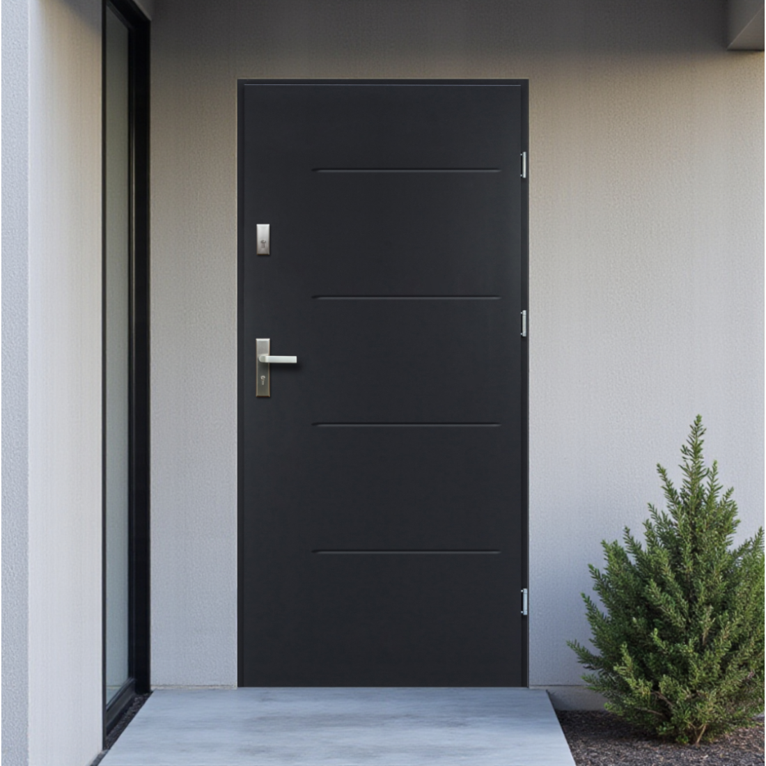 A Tytan acél kültéri bejárati ajtó letisztult, modern megjelenésével és antracit színével jól illeszkedik a mai homlokzatokhoz.