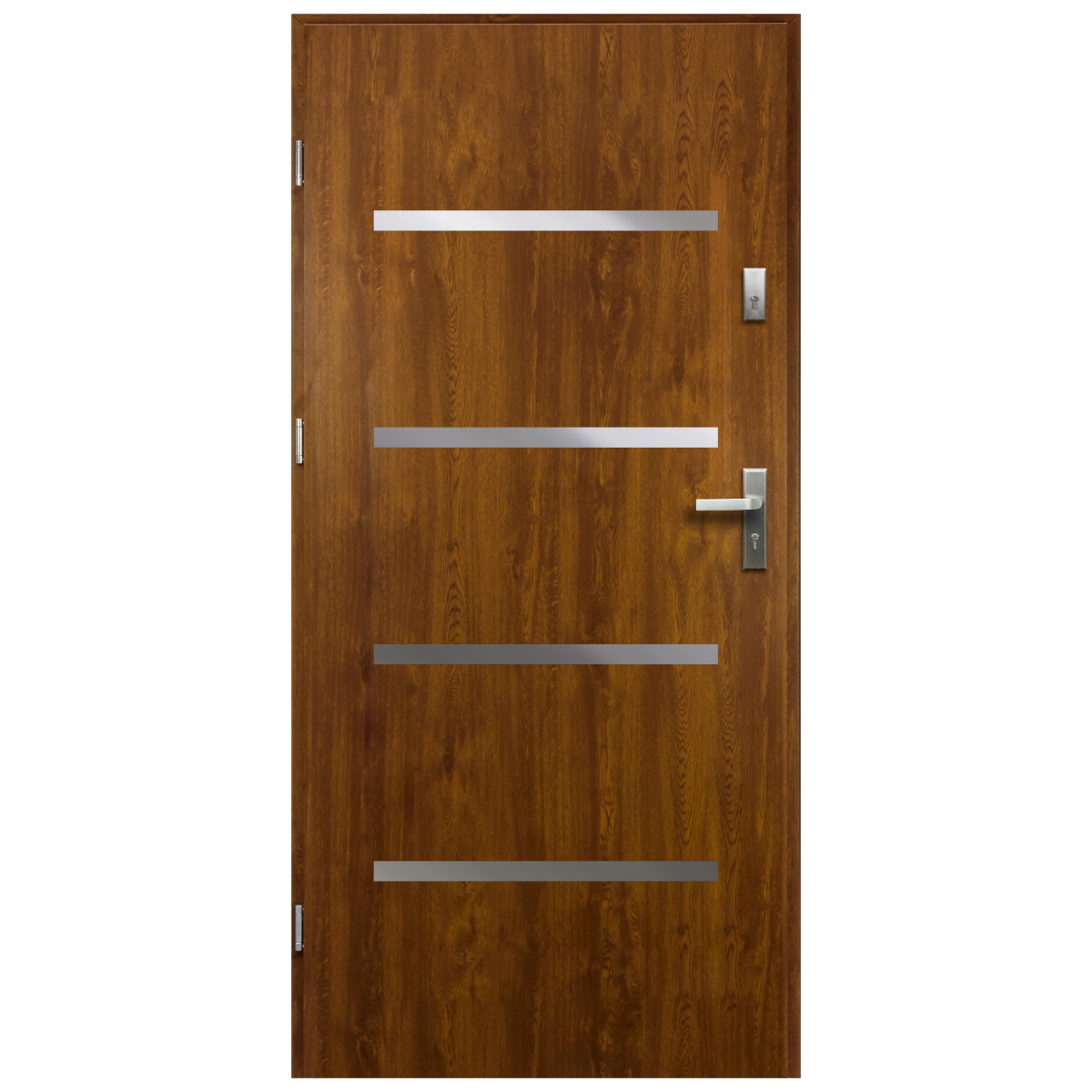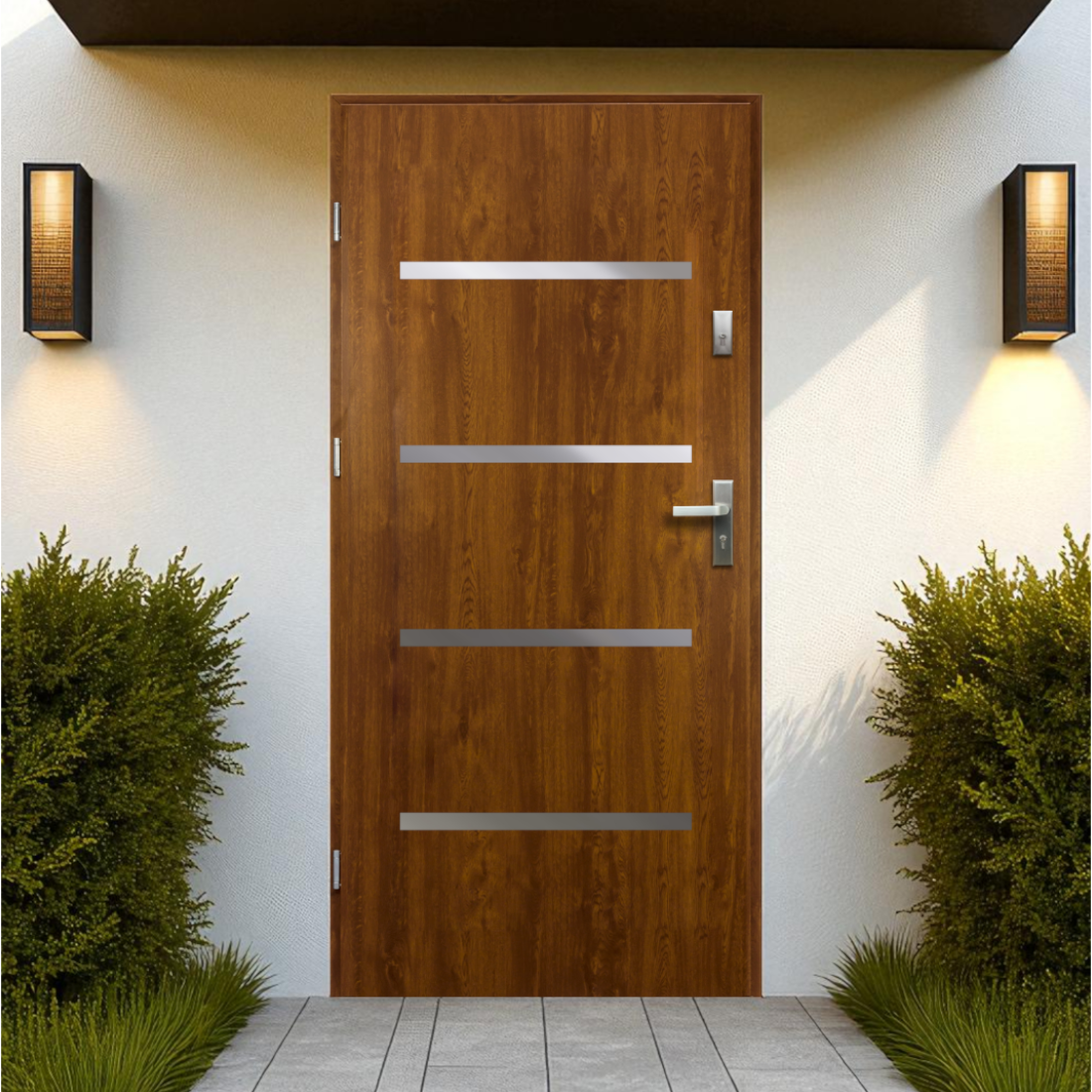A Westa kültéri bejárati ajtó arany tölgy megjelenésével otthonos, modern belépőt ad a homlokzatnak, a vízszintes díszítések pedig visszafogott, egységes képet teremtenek.