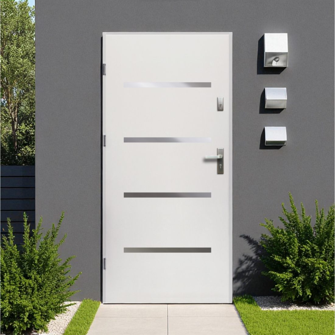 A Westa kültéri bejárati ajtó tiszta fehér megjelenésével rendezett, modern belépőt ad a homlokzatnak, a vízszintes díszítések pedig visszafogott, egységes képet teremtenek.