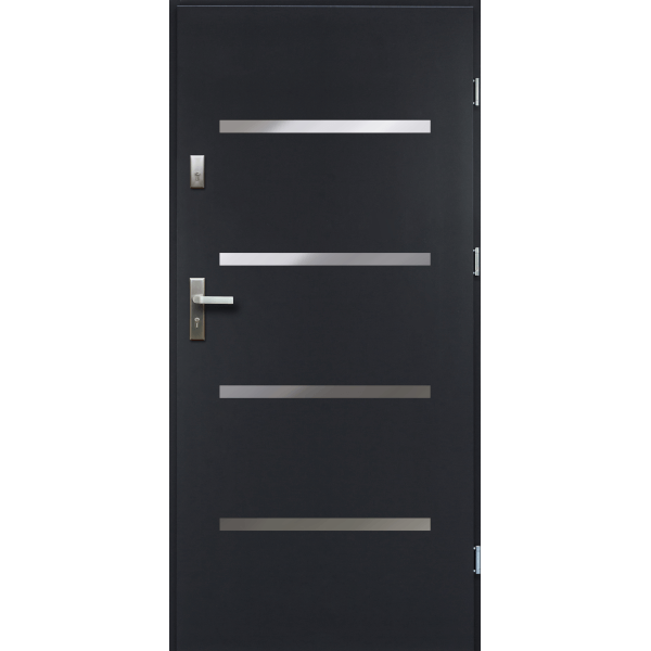 Az ajtó szárnyvastagsága 55 mm préselt acéllemez. Szigetelése expandált polisztirol. Lemez vastagsága: (ajtókeret/ajtólap) - 1,2 mm/0,6 mm. Felülete UV álló PVC dekorfóliával van bevonva. Az ajtó 2 független zárszerkezettel, valamint 3 állítható zsanérral van felszerelve, 180 fokos nyitási tartományban nyitható. Tömítés a keretben és a küszöbön. A beépítési egységcsomag tartozéka: 011-es kilincs, 03-as zárbetét.
