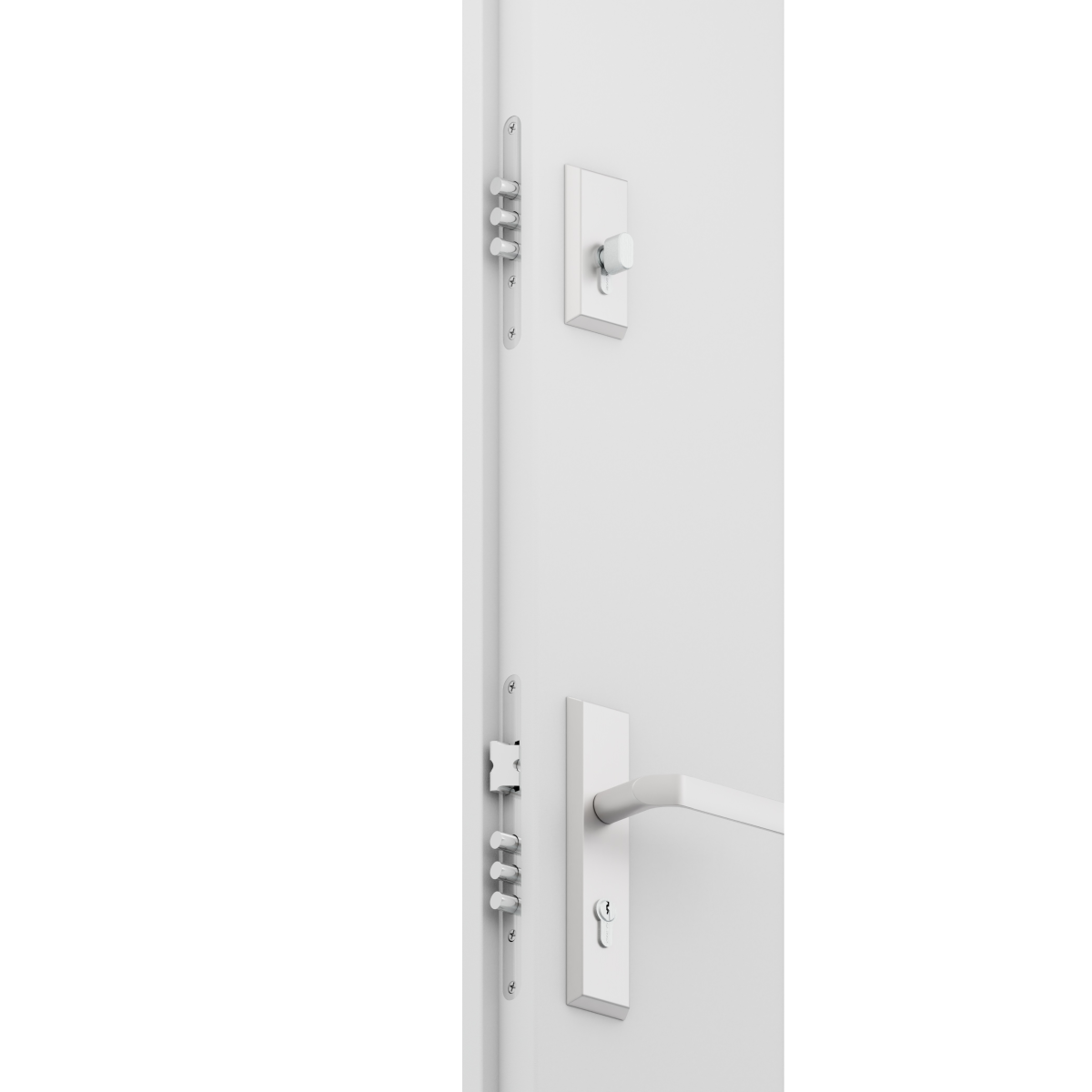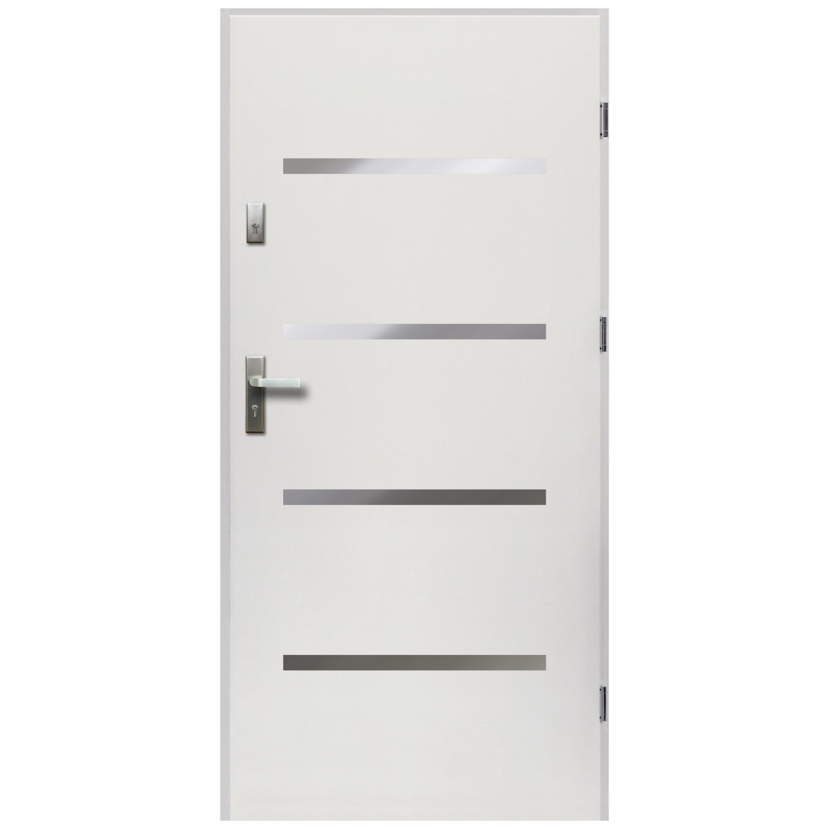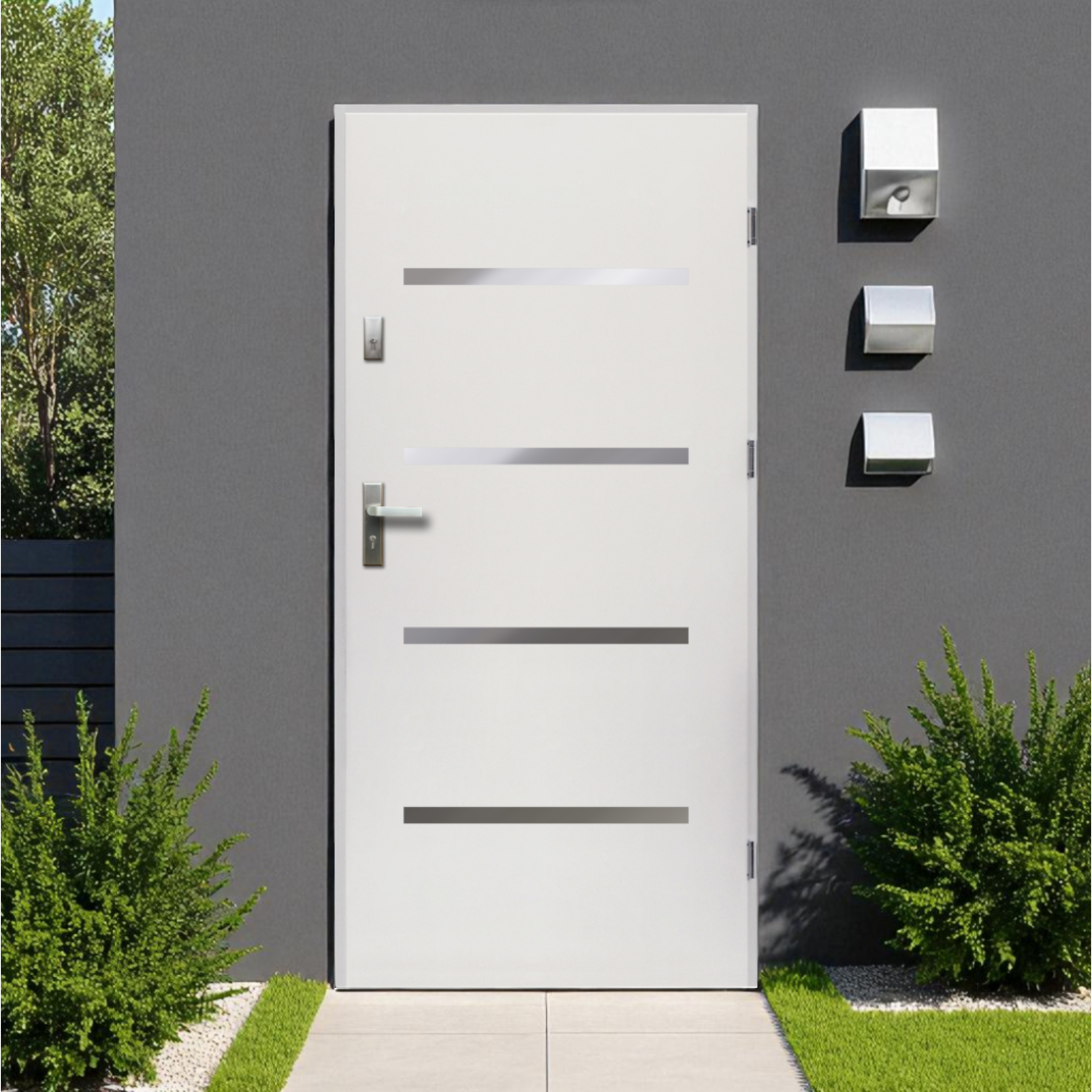 A Westa kültéri bejárati ajtó tiszta fehér megjelenésével rendezett, modern belépőt ad a homlokzatnak, a vízszintes díszítések pedig visszafogott, egységes képet teremtenek.