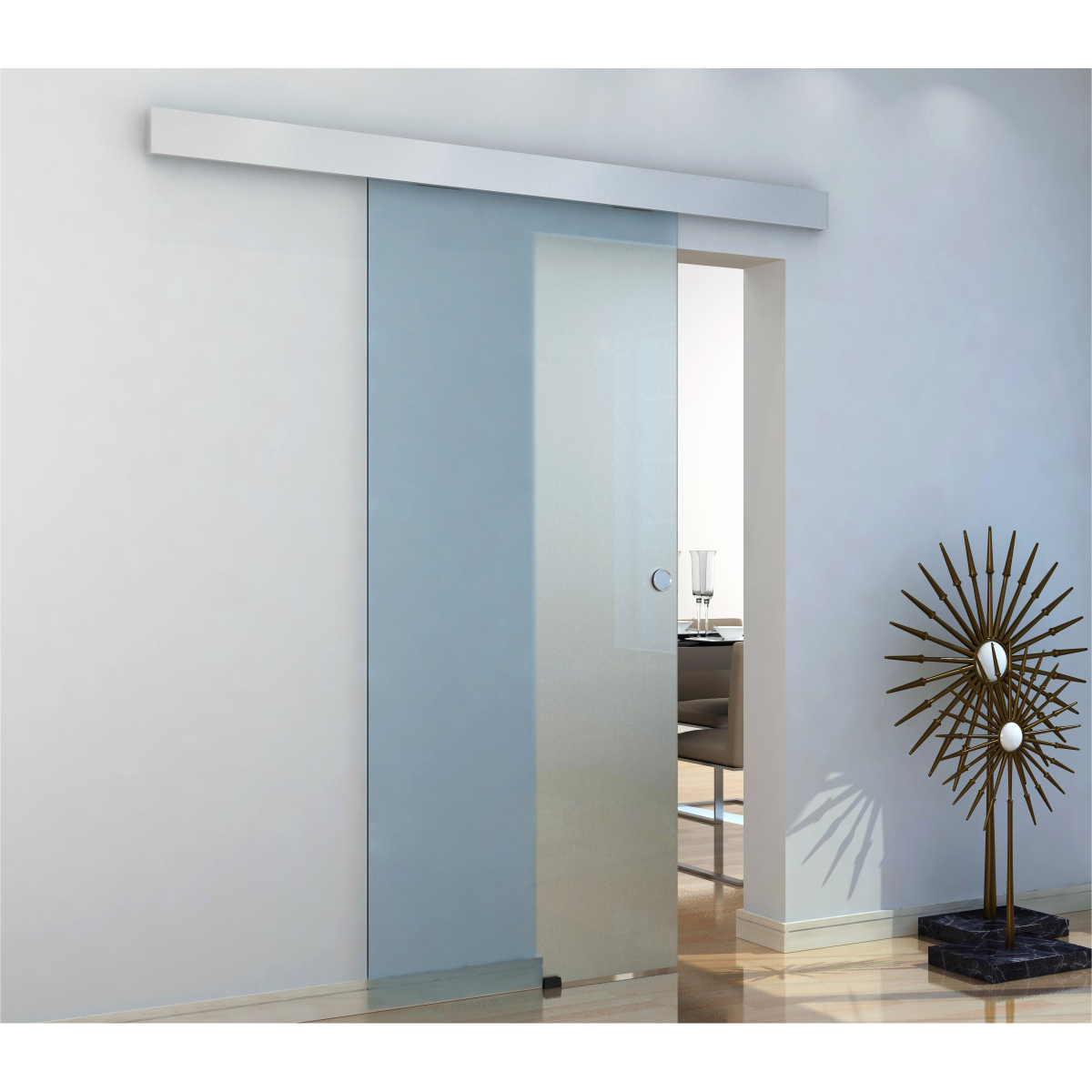 8 mm vastag, edzett savmart üveg tolóajtó-ajtólap, melyet egy elegáns tartó konzolra lehet felfüggeszteni.