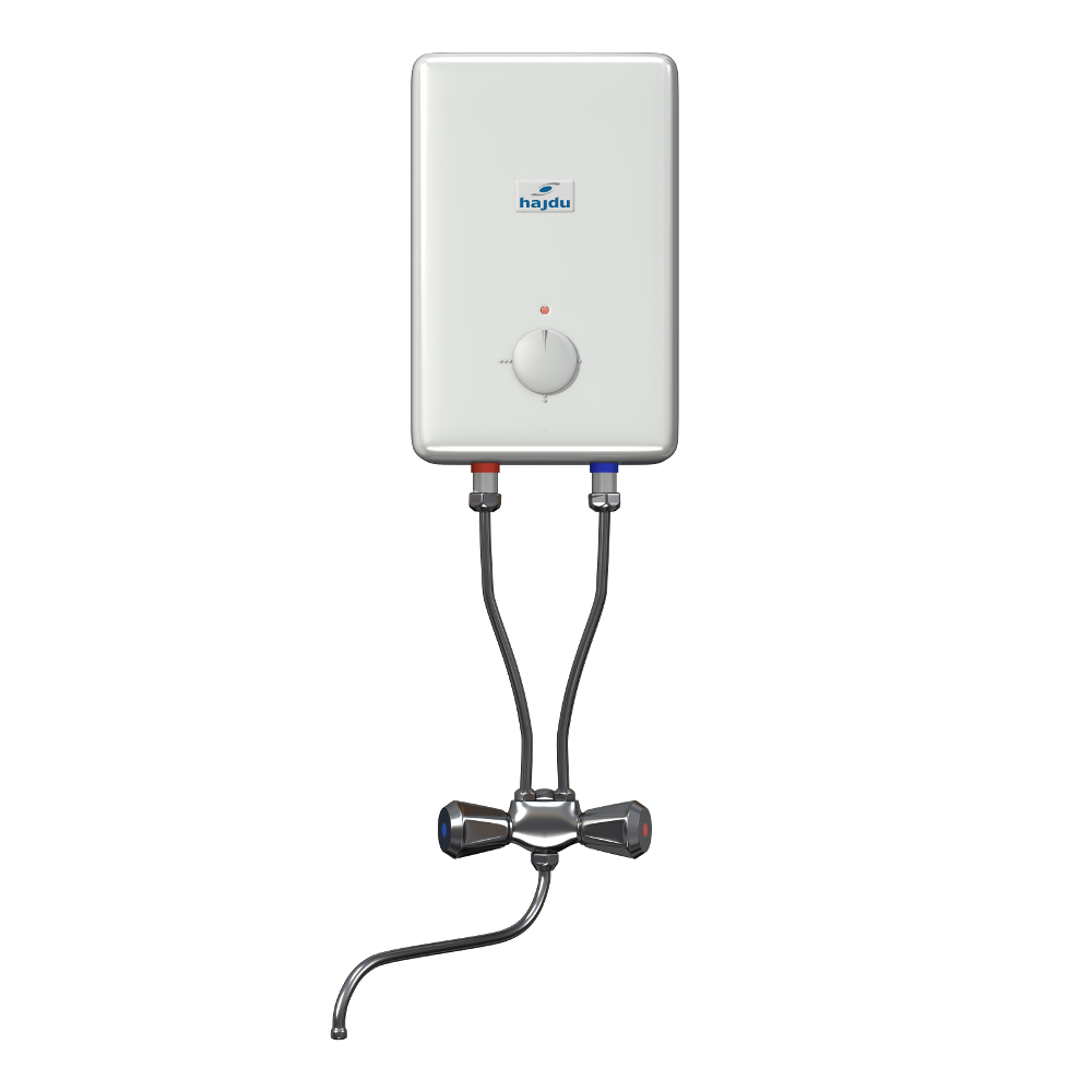 Hajdu FT5 elektromos vízmelegítő csapteleppel, űrtartalom: 5 l, nyílt rendszerű, szabadkifolyású, egy vízvételi hely ellátására, mosdókagyló / mosogató / konyhapult fölé. Teljesítmény: 1500 W, vízhőmérséklet: maximum 80°C, felfűtési idő (65°C-ra): 14 perc, készenléti energia (65°C-on): 0,40 kWh/24 h, vízcsatlakozás: 1/2", csapolási profil: XXS, burkolat: magasfényű, fehér ABS műanyag, használaton kívül kikapcsolható.
