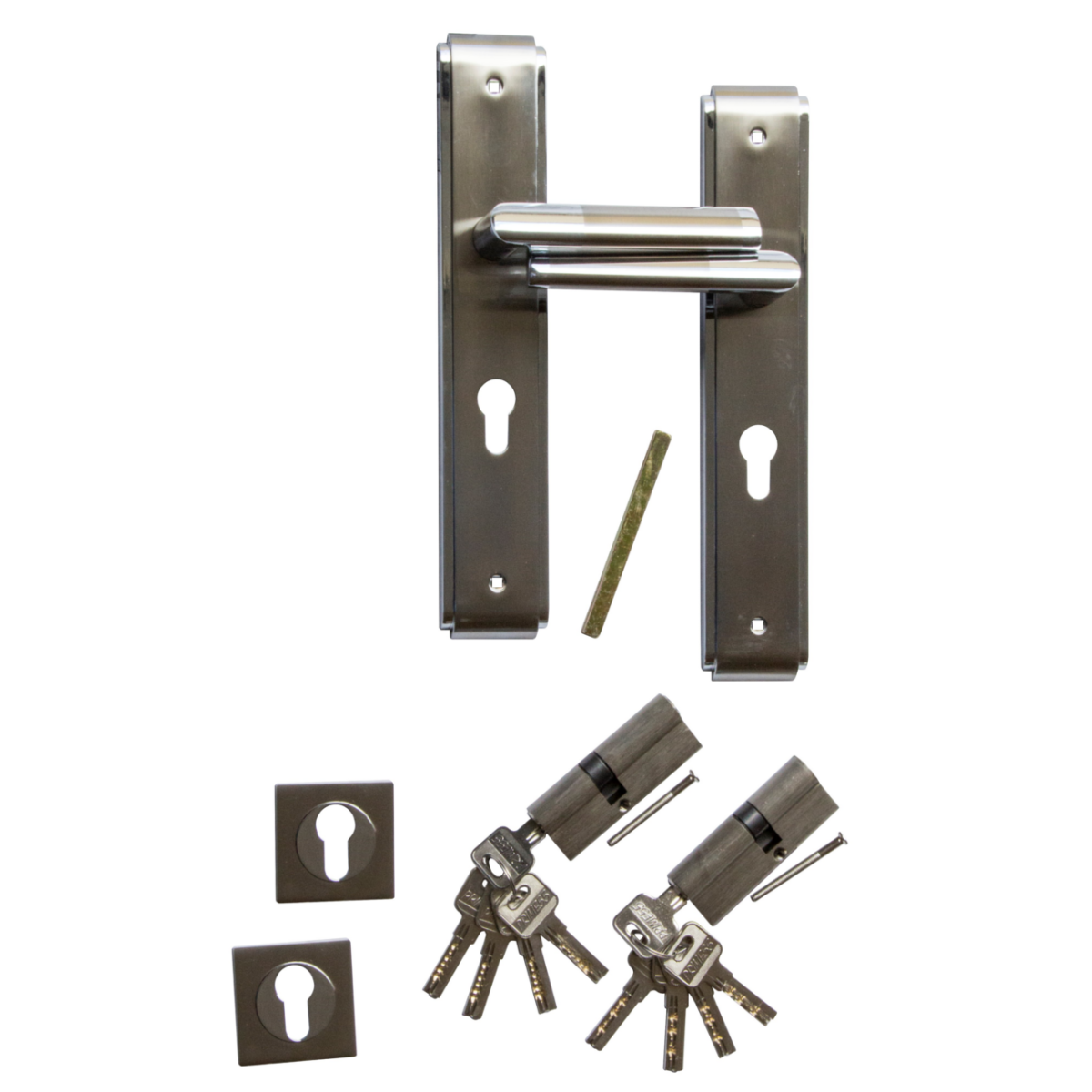Beépítési egységcsomag Prime 55 típusú acél bejárati ajtókhoz.A készlet tartalma: kilincs, alsó és felső zárbetét, felső zártakaró.
