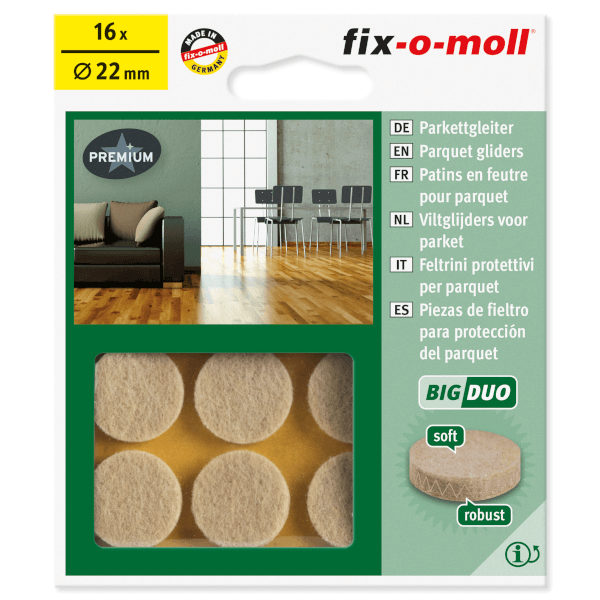 22 mm-es öntapadós padlóvédő, 16 db/csomag kiszerelésben. Ezekkel az öntapadós padlófilcekkel a székek, a fotelok vagy az asztalok finoman, csendesen mozgathatók, a padló felületének károsítása nélkül, illetve természetesen az exkluzív burkolólapokat és laminált padlókat is megvédheti. A lágy csúszó réteg, a szilárd stabilizáló réteg és a nagyon erős ragasztóanyag speciális kombinációja optimális védelmet nyújt a padlóknak. Ez garantálja a nagy kopásállóságot és a hosszú élettartamot a BIGDUO padlófilceknek. Magas kopásállóság, rendkívül stabil ragasztás, különösen erős és rugalmas, a legellenállóbb nyíró-szilárdságú ragasztó a piacon, rendkívül magas kohézió, azonnali teljes tapadás.