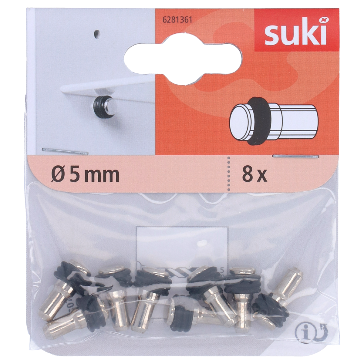 5 mm-es, fém/gumi üvegpolc tartó fekete színben, 8 db/csomag kiszerelésben. Az üvegpolctartók arra szolgálnak, hogy biztonságosan rögzítsék a bútorokban lévő üvegpolcokat és -paneleket. Könnyen behelyezhetők az előfúrt lyukakba.