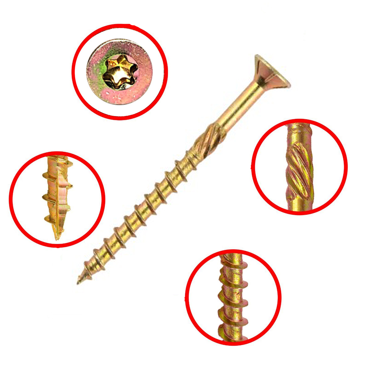 Csavarfej: süllyesztett fejű. Torx csillaghornyos. Sárga horganyzott.