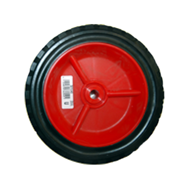 Fűnyíró kerék, fekete/piros színben. Anyaga: műanyag. Mérete: 175mm, teherbírás: 40kg.