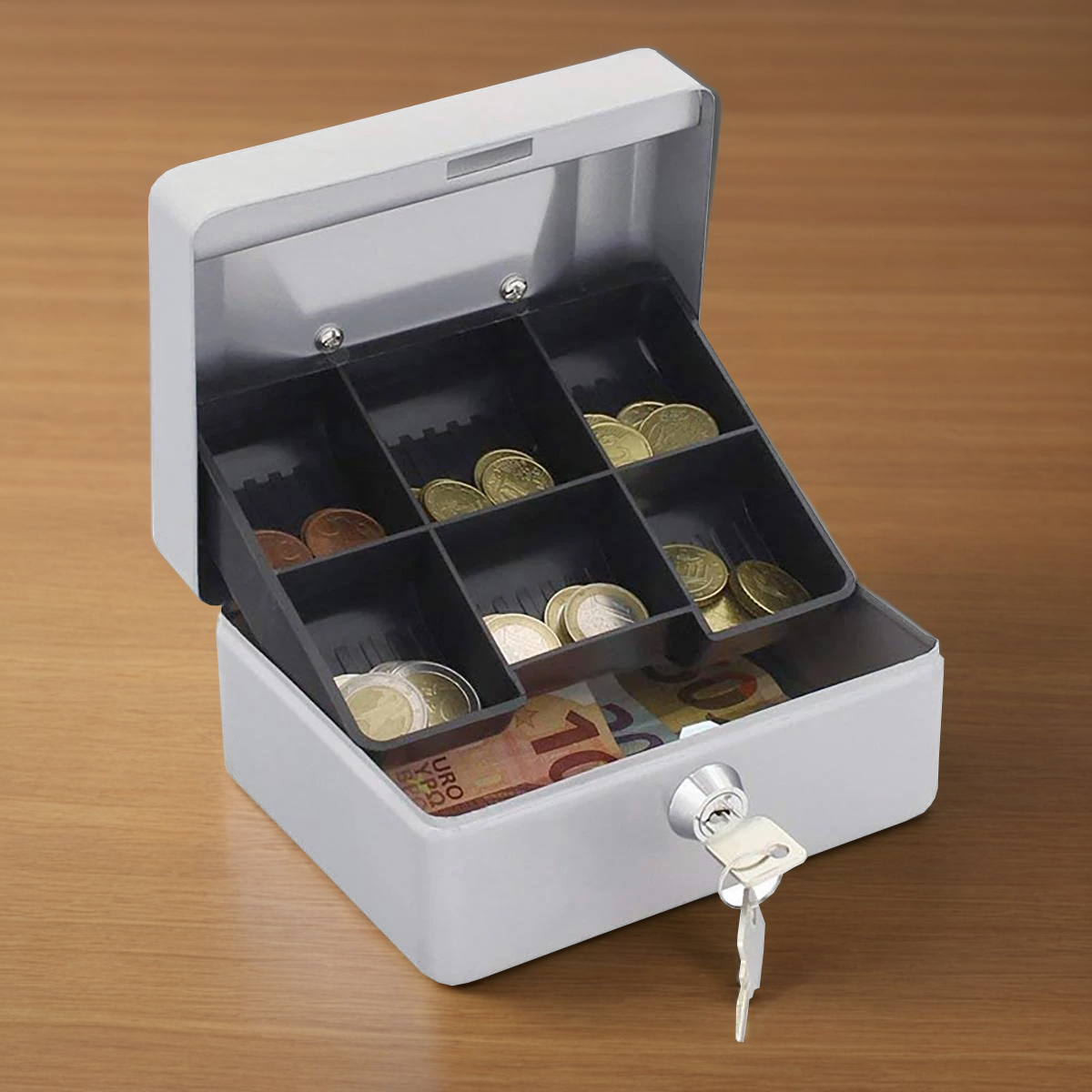 Hordozható, zárható pénzkazetta ezüst színben. Aprópénztartó betéttel, melynek mérete 15x8x12 cm. Fedezze fel pénzkazettáinkat, melyek magas szintű biztonságot nyújtanak. Akár otthon, akár irodában, mindenhol védelmet adnak és tökéletes megoldást jelent. Fogantyúval könnyen hordozható 2 kulccsal zárható pénzes kazetta. Bankjegyek és aprópénz elkülönített tárolására.