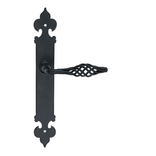 Kovácsolt vas jellegű ajtókilincs, fekete színben, mérete: 90 mm.