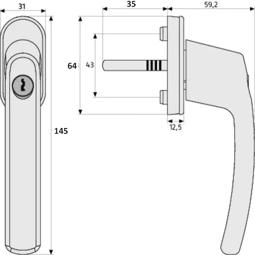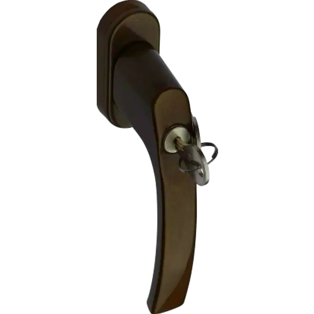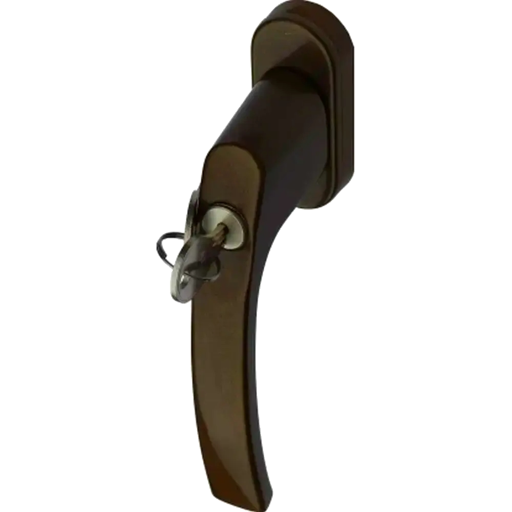 Egyszerű kivitelű zárható ablakkilincs; fém alaplappal, alumínium alapanyagból bronz színben. Anyaga: porszórt alumínium.