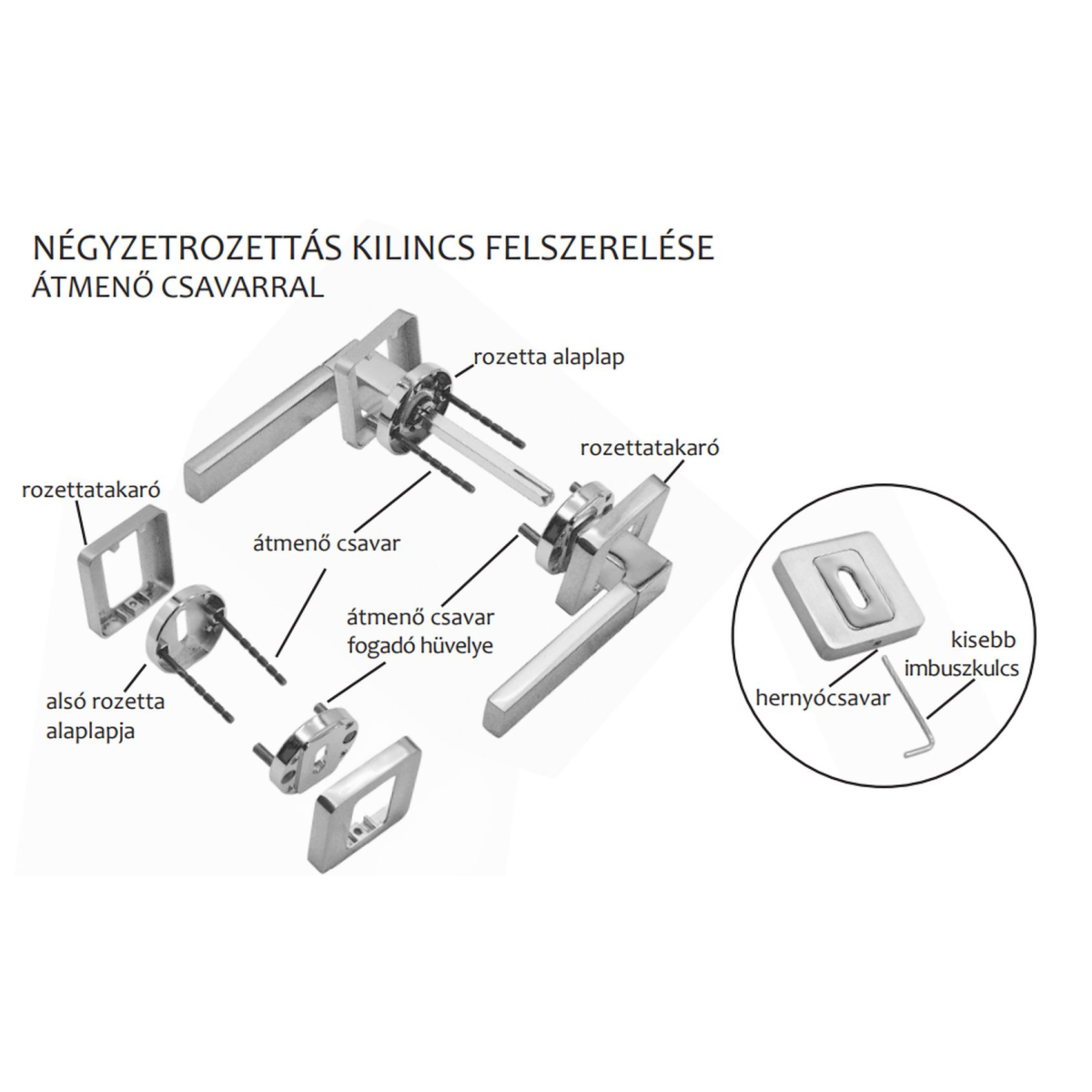 Modern stílusú, négyzetrozettás, rugós müködtetésű, cilinder záras ajtókilincs. Letisztult formájának köszönhetően bármely enteriőrbe illeszkedik. Tartozékok: négyzetvas, rögzítőcsavarok.