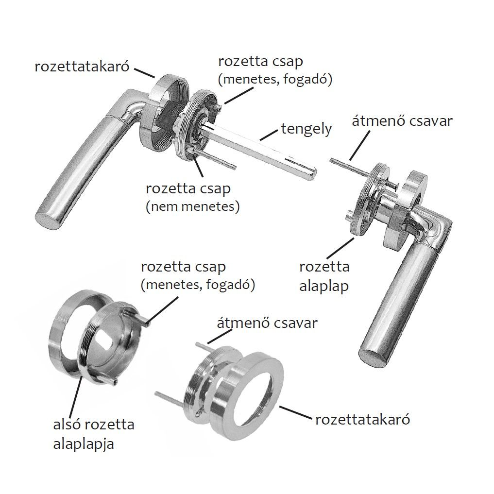 Rozsdamentes acélból készült, rozettás ajtókilincs fémházas kivitelben. Típus: NZ (normálzár), beltéri ajtókhoz. Tartozékok: négyzetvas, rögzítő csavarok. Letisztult formájának köszönhetően bármely enteriőrbe illeszkedik.