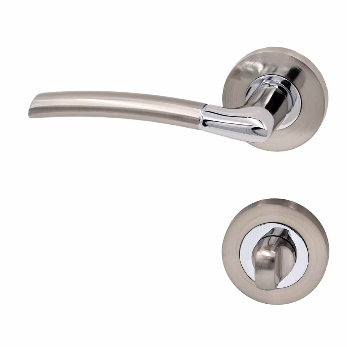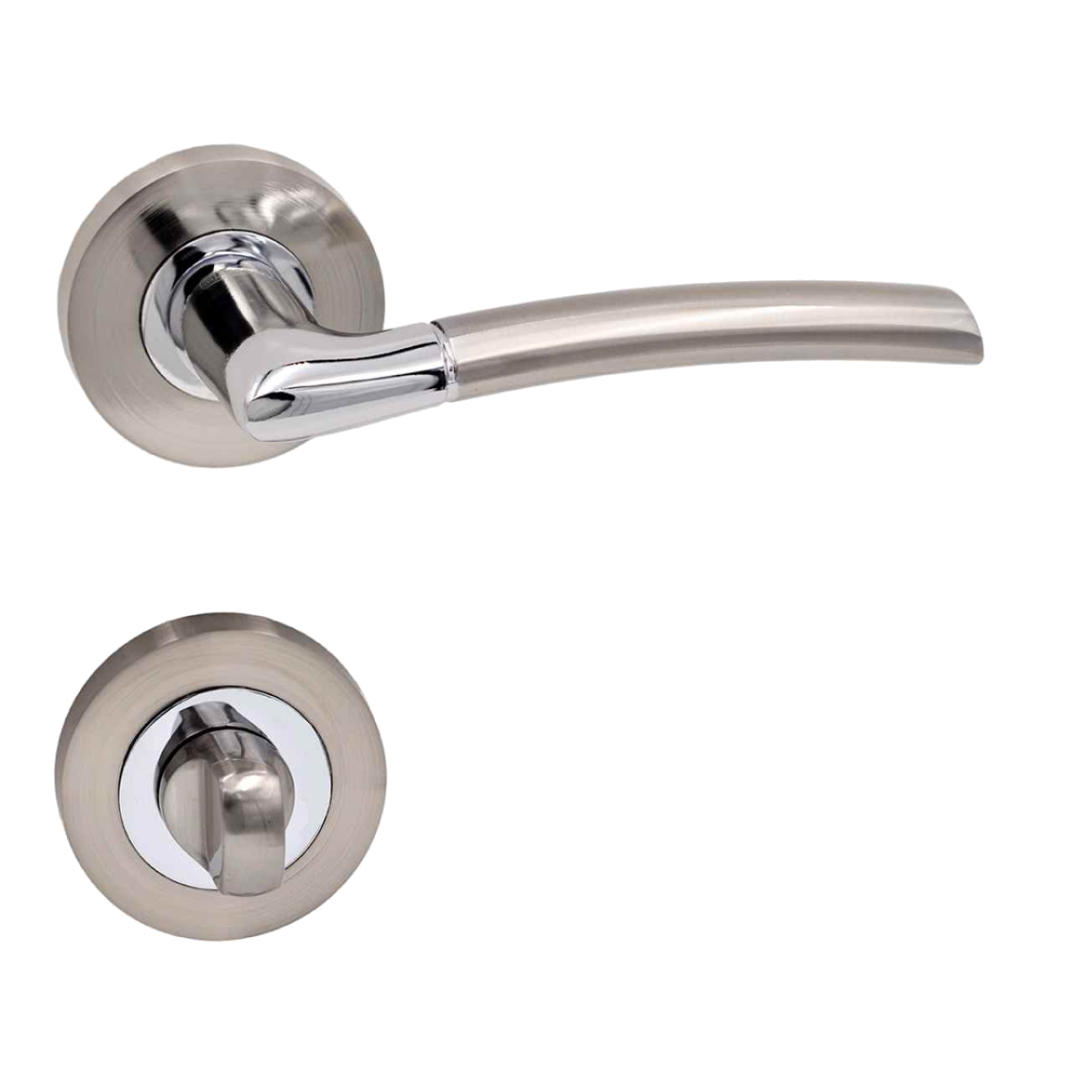 Modern stílusú, körrozettás, rugós müködtetésű, toalett záras ajtókilincs. Szatén és króm felülettel, mosdó, wc ajtókhoz. Letisztult formájának köszönhetően bármely enteriőrbe illeszkedik. Tartozékok: négyzetvas, rögzítőcsavarok.