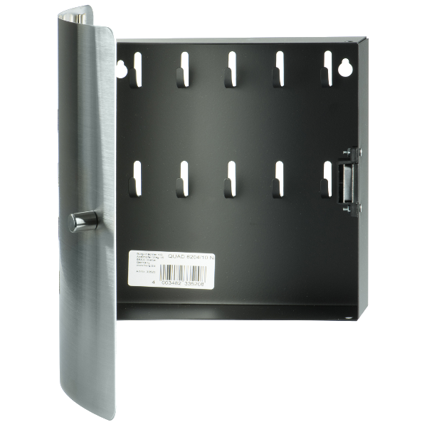 Kulcstároló - rozsdamentes acél ajtó - fekete acéllemez ház - mágneszár - 10 db akasztó - Mérete: 210x240x70 mm