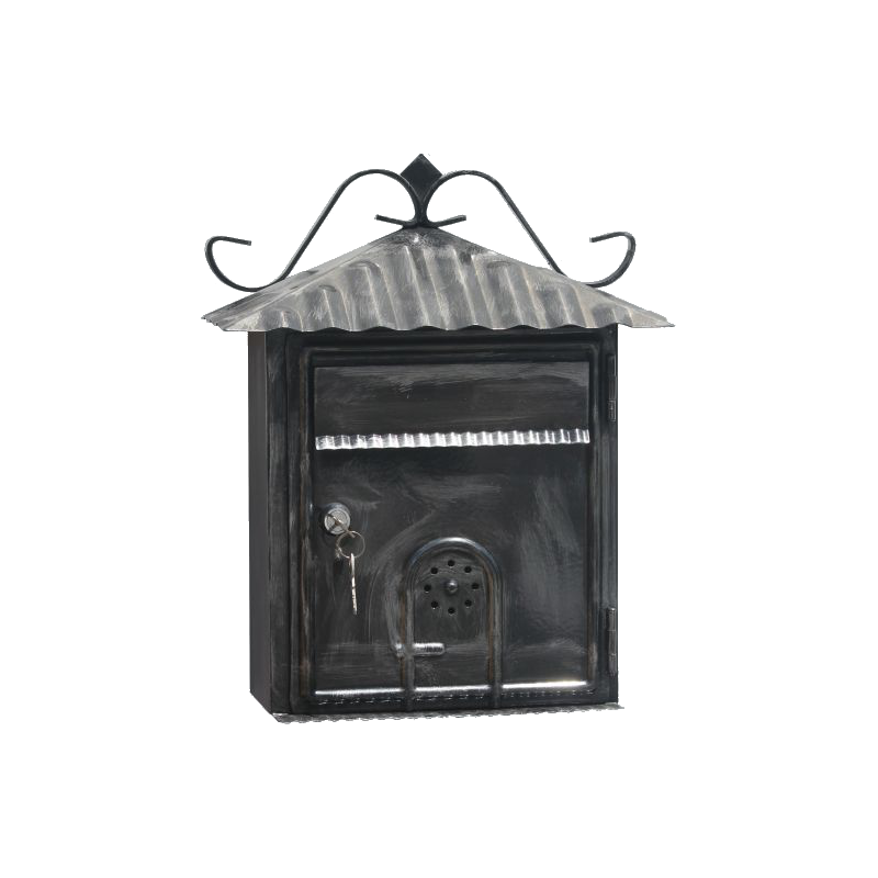 "Rustica" postaláda 250x90x360 mm, vaslemez, festett, kovácsoltvas jellegű, elől bedobós, feketés szürke színben.