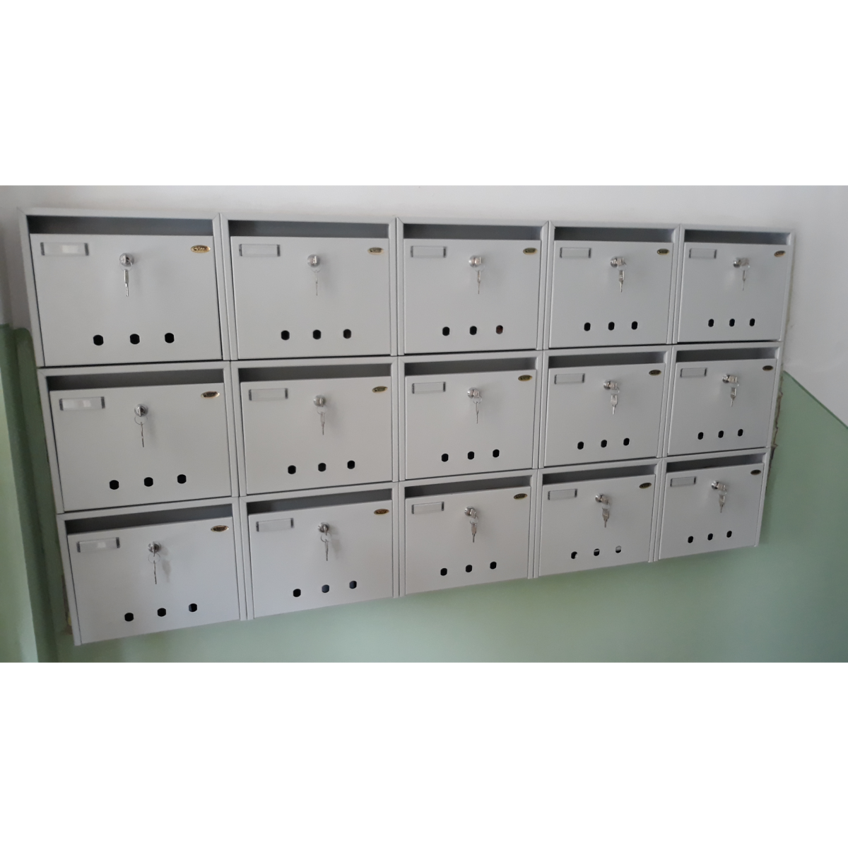 A Trezor világosszürke beltéri postaláda masszív és praktikus megoldás társasházak lépcsőházába. Kialakítása illeszkedik a hagyományos postaládák méretéhez, így könnyen beépíthető meglévő rendszerekbe, miközben biztonságos és jól használható tárolást biztosít a küldemények számára.