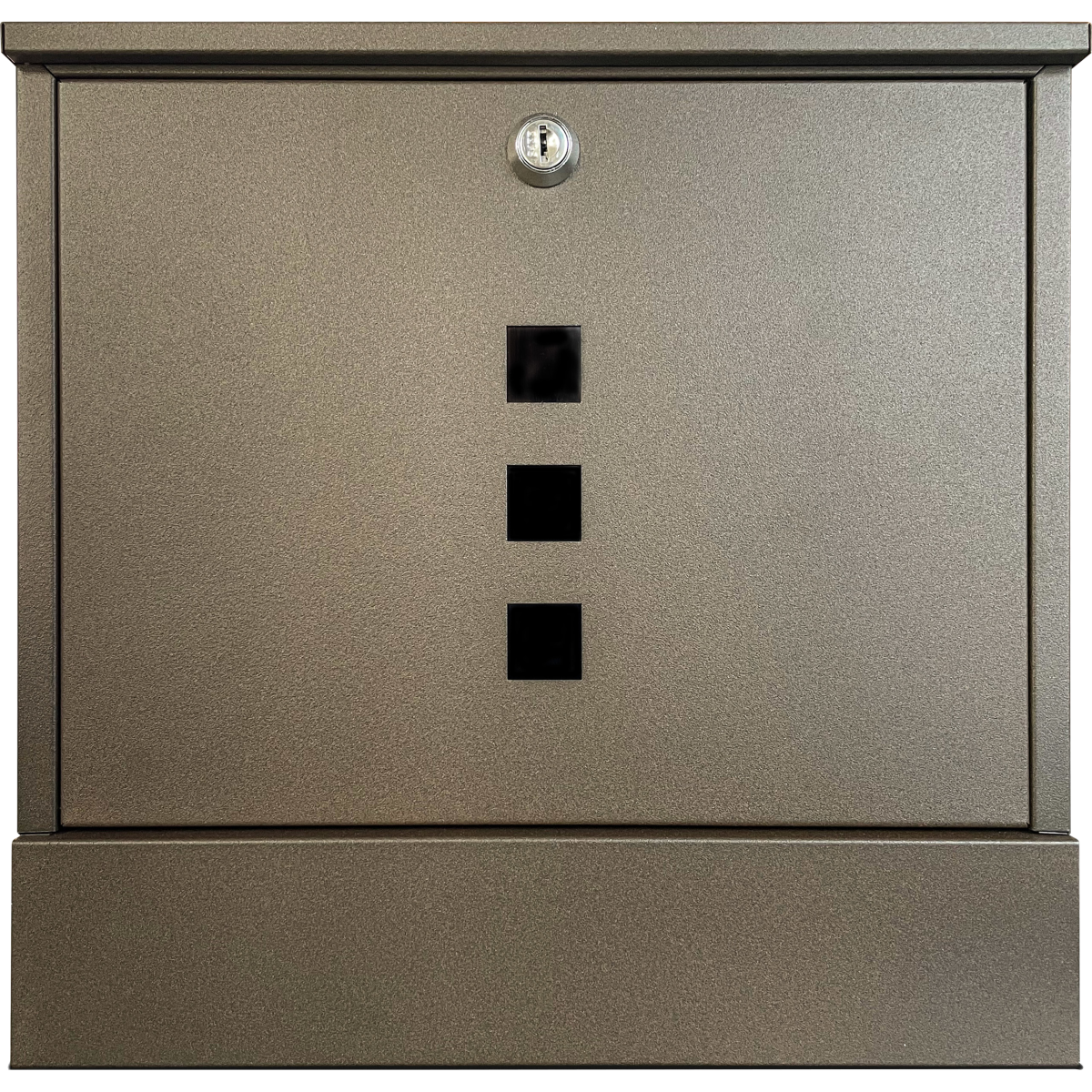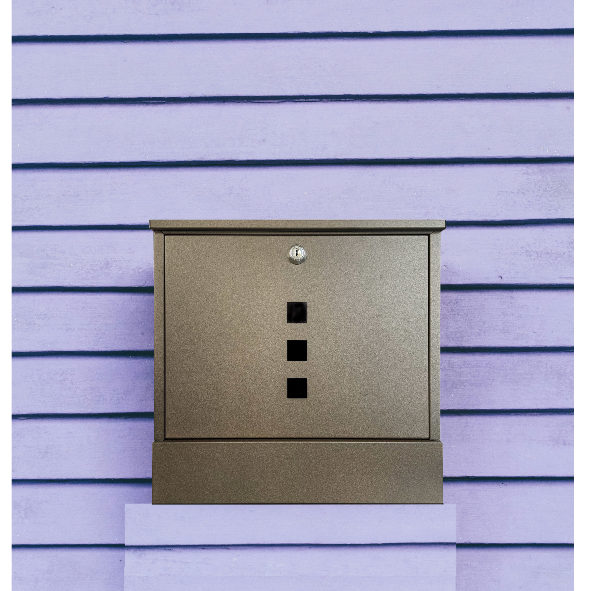 Az egyik legkedvezőbb modern formájú postaláda. 3 db lézervágott betekintőnyílással a küldemények könnyebb (a betekintőnyílás az ajtón belül víztiszta plexivel védett) vizuális észlelése érdekében. Reklám-, szórólaptartó a levélszekrény alatt. Felső bedobónyílás a küldemények könnyebb behelyezésére. Kültéri kivitel, horganyzott 0,5 mm vastag acéllemezből. Az A4-es méretű és nagyobb méretű küldemények is elférnek a testben. A kulcsok sorszámozottak (sorszám alapján utánrendelhetőek).
