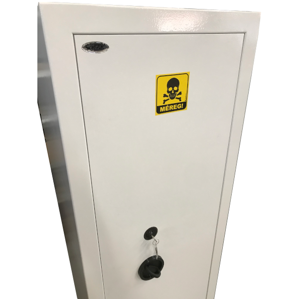 Magas biztonsági fokú gyógyszertároló szekrény, 2 mm vastag acéllemezből készült test és duplafalú ajtó, MABISZ A besorolás, A megerősített és süllyesztett, dupla falú ajtó nagyobb hatékonysággal áll ellen a kifeszítéssel próbálkozó támadóval szemben A zárásról „A” oszt. minősített biztonsági széfzár (2 db 65 mm-es kulcs) gondoskodik, mely az un. „megfúrásos” támadásokkal szemben külön védelmet kapott A zárszerkezet 3 irányba 5 ponton zár, 22 mm-es acélcsapokkal. A még biztonságosabb tárolás érdekében rögzítő furatokat helyeztünk el szekrény hátoldalán 1 db fix és 3 db állítható polc segíti a gyögyszerek áttekinthető elrendezésére. Opcióként kérhető: zárható belső trezor vagy rozsdamentes savtálca is. Alapszín: fehér Magyar termék, a békéscsabai üzemünkben készül. Tartozékok: 2 db biztonsági kulcs 1 db fix és 3 db állítható polc Rögzítő csavarok, tiplik. Figyelmeztető matricák.