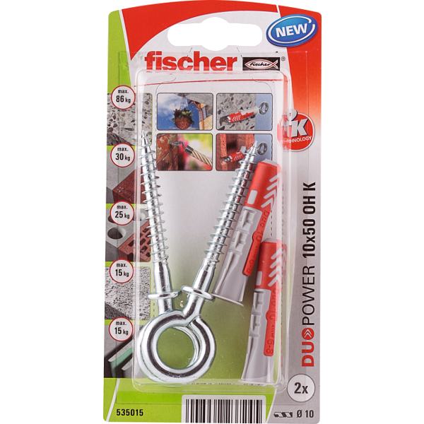 Fischer Duopower 10x50mm dübel 2db csavarral - elő és átmenő szereléshez - feszítés, alakformálódás, csomósodás - alkalmazható: beton, tégla, gipszkarton, üreges födém, terméskő, forgácslap