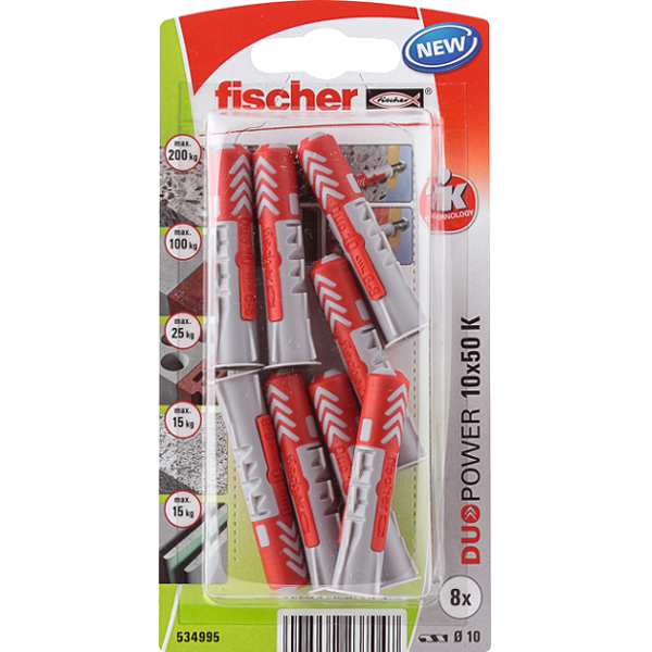 Fischer Duopower 8db 10x50mm-es dübel - elő és átmenő szereléshez - feszítés, alakformálódás, csomósodás - alkalmazható: beton, tégla, gipszkarton, üreges födém, terméskő, forgácslap