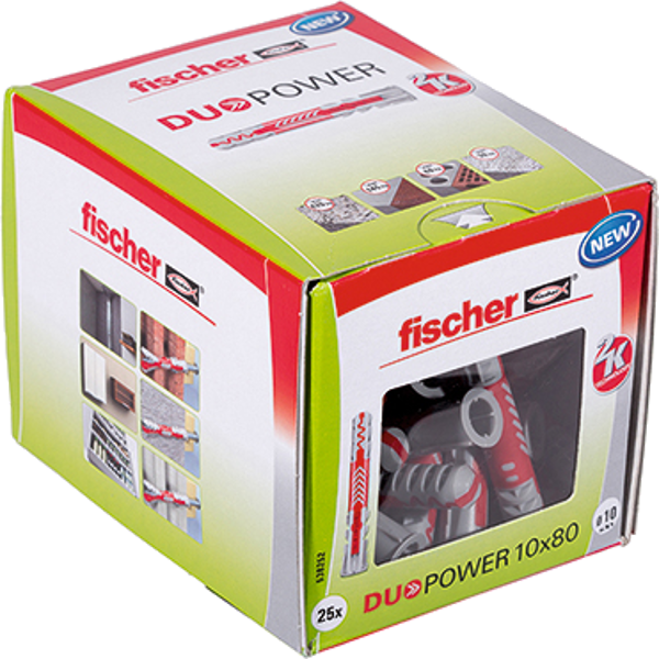 Fischer Duopower 25db 10x80mm-es dübel - elő és átmenő szereléshez - feszítés, alakformálódás, csomósodás - alkalmazható: beton, tégla, gipszkarton, üreges födém, terméskő, forgácslap