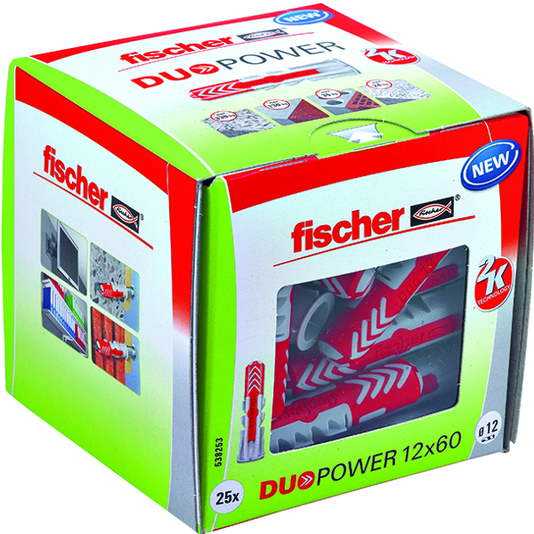 Fischer Duopower 25db 12x60mm-es dübel - elő és átmenő szereléshez - feszítés, alakformálódás, csomósodás - alkalmazható: beton, tégla, gipszkarton, üreges födém, terméskő, forgácslap.