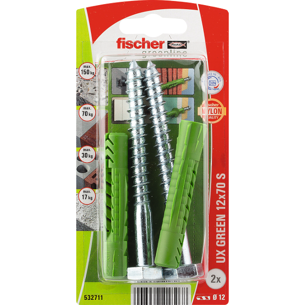 Fischer UX Green 2db 12x70mm-es dübel csavarral - előszereléshez - terpesztés, csomósodás - alkalmazható: beton, tégla, gipszkarton, üreges födém, terméskő, forgácslap