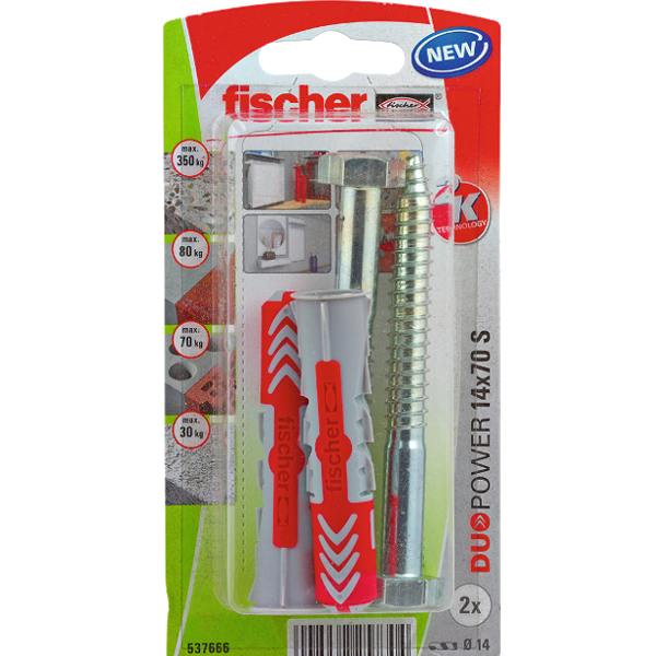Fischer Duopower 2db 14x70mm-es dübel csavarral - elő és átmenő szereléshez - feszítés, alakformálódás, csomósodás - alkalmazható: beton, tégla, gipszkarton, üreges födém, terméskő, forgácslap