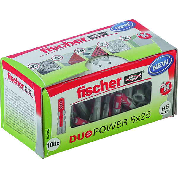Fischer Duopower 100db 5x25mm-es dübel - elő és átmenő szereléshez - feszítés, alakformálódás, csomósodás - alkalmazható: beton, tégla, gipszkarton, üreges födém, terméskő, forgácslap