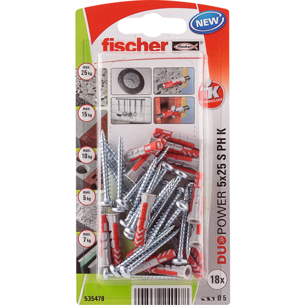 Fischer Duopower 18db 5x25mm-es dübel lencsefejű csavarral - elő és átmenő szereléshez - feszítés, alakformálódás, csomósodás - alkalmazható: beton, tégla, gipszkarton, üreges födém, terméskő, forgácslap