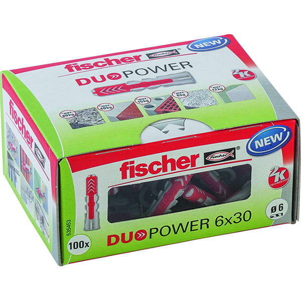 Fischer Duopower 100db 6x30mm-es dübel - elő és átmenő szereléshez - feszítés, alakformálódás, csomósodás - alkalmazható: beton, tégla, gipszkarton, üreges födém, terméskő, forgácslap