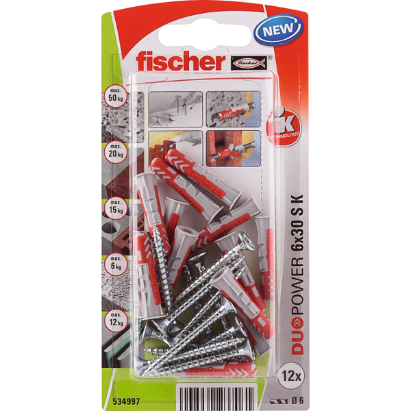 Fischer Duopower 12db 6x30mm-es dübel csavarral - elő és átmenő szereléshez - feszítés, alakformálódás, csomósodás - alkalmazható: beton, tégla, gipszkarton, üreges födém, terméskő, forgácslap