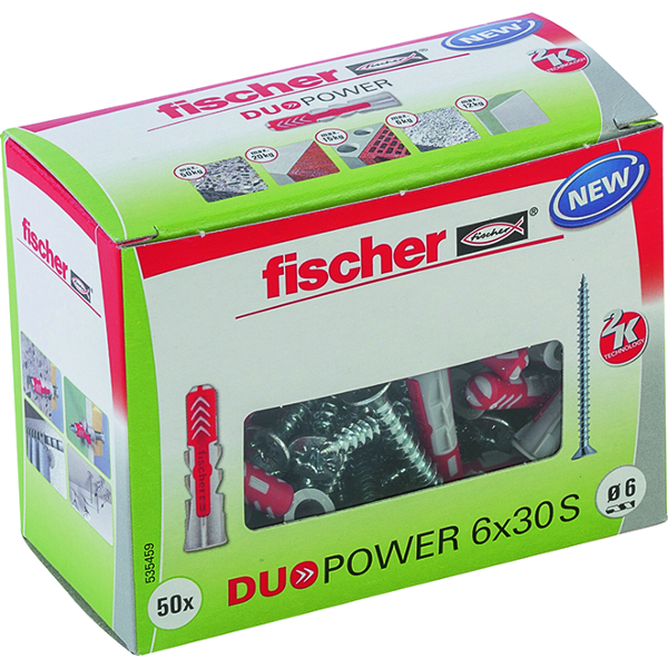 Fischer Duopower 50db 6x30mm-es dübel csavarral - elő és átmenő szereléshez - feszítés, alakformálódás, csomósodás - alkalmazható: beton, tégla, gipszkarton, üreges födém, terméskő, forgácslap