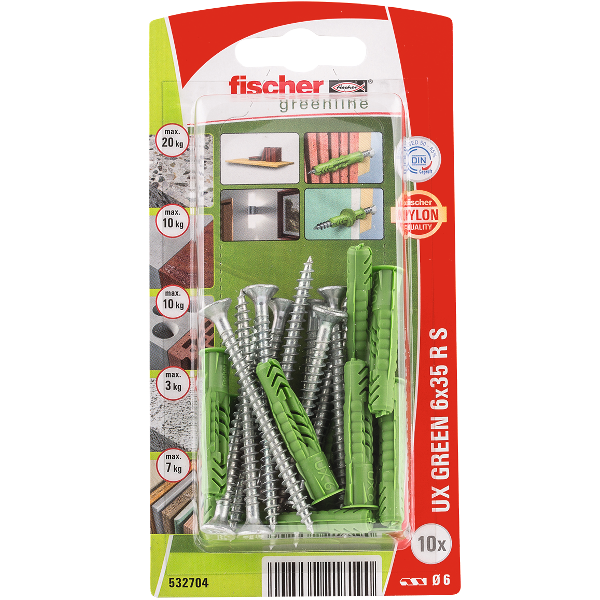 Fischer Duopower UX Green 10db 6x35mm-es dübel csavarral - előszereléshez - terpesztés, csomósodás - alkalmazható: beton, tégla, gipszkarton, üreges födém, terméskő, forgácslap