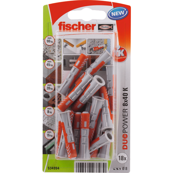 Dűbel "FISCHER DUOPOWER" - 18db 8x40mm dűbel - elő és átmenő szereléshez - feszítés, alakformálódás, csomósodás - alkalmazható: beton, tégla, gipszkarton, üreges födém, terméskő, forgácslap