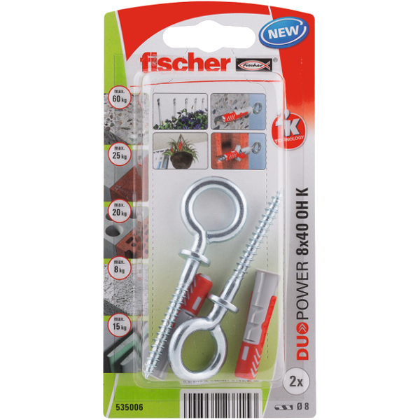 Dűbel "FISCHER DUOPOWER" - 2db 8x40mm dűbel 2db csavarral - elő és átmenő szereléshez - feszítés, alakformálódás, csomósodás - alkalmazható: beton, tégla, gipszkarton, üreges födém, terméskő, forgácslap