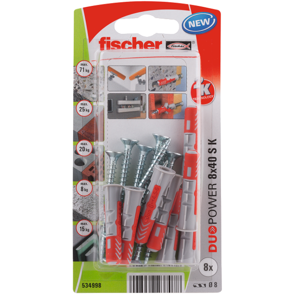 Dűbel "FISCHER DUOPOWER" - 8db 8x40mm dűbel 8db csavarral - elő és átmenő szereléshez - feszítés, alakformálódás, csomósodás - alkalmazható: beton, tégla, gipszkarton, üreges födém, terméskő, forgácslap