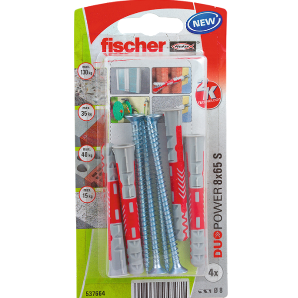 Dűbel "FISCHER DUOPOWER" - 4db 8x65mm dűbel 4db csavarral - elő és átmenő szereléshez - feszítés, alakformálódás, csomósodás - alkalmazható: beton, tégla, gipszkarton, üreges födém, terméskő, forgácslap