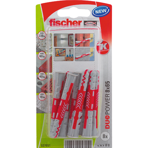 Dűbel "FISCHER DUOPOWER" - 8db 8x65mm dűbel - elő és átmenő szereléshez - feszítés, alakformálódás, csomósodás - alkalmazható: beton, tégla, gipszkarton, üreges födém, terméskő, forgácslap