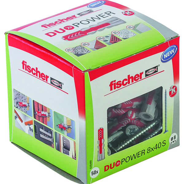 Dűbel "FISCHER DUOPOWER" 25db, mérete: 8x65mm, dűbel 25db csavarral - elő és átmenő szereléshez, feszítés, alakformálódás, csomósodás. Alkalmazható: beton, tégla, gipszkarton, üreges födém, terméskő, forgácslap.