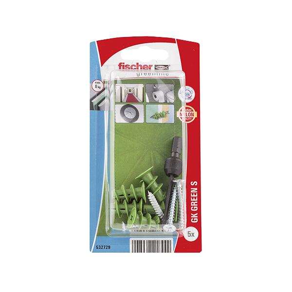 Ideális választás sorozatszereléseknél, legalább 50% megújuló nyersanyagból készült és ezáltal nagy mértékben környezetbarát, hatékony és biztos tartás mint a hagyományos GK dübelnél. A mellékelt gipszkartonfúró fúrási és szerelési funkciót is betölt, ezáltal gyors és egyszerű a szerelés. Az éles bemetszőmenet formazárással biztos rögzítést nyújt, ezáltal nagyfokú biztonságot érhetünk el. A kis rögzítési mélységének köszönhetően, csak kis üregre van szükség a gipszkarton mögött, ennek eredményeként, a GK dübel ismeretlen lapvastagságoknál és üregmélységeknél is használható. A GK dübel a legtöbb csavartípussal, kampóval és szemes csavarral használható, ez széles körben teszi lehetővé az alkalmazhatóságát. A dübel túlhúzását el kell kerülni, ezért az akkus csavarozóval történő szereléskor a megfelelő nyomaték beállítása ajánlott, 4,0-5,0 mm-es fa-, faforgács-, illetve lemezcsavarokkal alkalmazható, 15 mm-nél vékonyabb lapoknál előfúrás nem szükséges. Nem alkalmas szálas gipszlapokhoz, csempézett gipszkartonhoz, alkalmazás: képek, lámpák, elektromos szerelések, csatlakozó tartozékok.