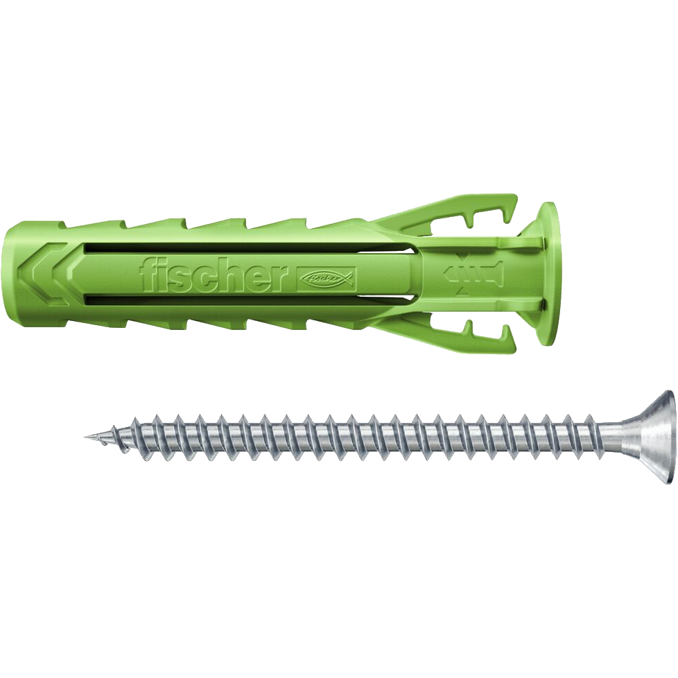 Minden SX Plus Green legalább 50% újrahasznosított alapanyagokból készül. A 4 irányú feszítésének köszönhetően a fischer SX Plus dübel a tömör építőanyagok, például beton, mészhomoktégla és egyéb falazatok specialistája. A speciális rögzítőpengék biztosítják a csavar előrögzítését, aminek köszönhetően a fej feletti beépítéseknél nem kell külön azt megtartani. Ezáltal rugalmas és kényelmes szerelési folyamatot tesz lehetővé a felhasználó számára. A rugalmas perem megakadályozza, hogy a dübel mélyebbre csússzon ezáltal még biztonságosabb telepítést kapunk. A hozzácsomagolt csavarok optimálisan alkalmasak a fischer SX Plus dübelhez