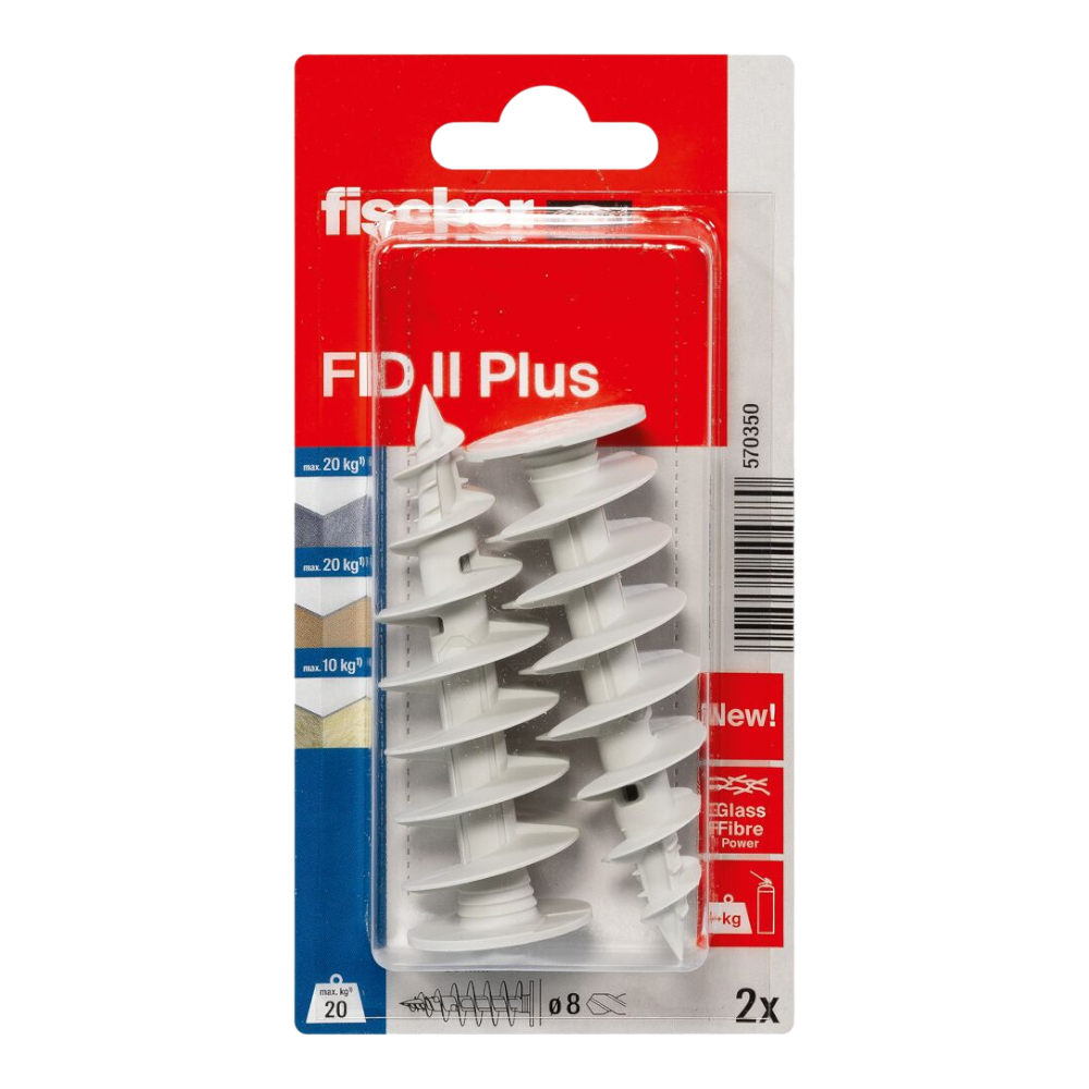 A fischer FID II Plus szigetelőanyag dübel alkalmazható közepesen nehéz tárgyak rögzítéséhez vakolt és nem vakolt szigetelőanyagok esetén, mint pl. polisztirol és poliuretán. A dübel hegyének kombinált központosító, maró és vágó funkciójának köszönhetően a FID II Plus pontosan becsavarható. A szigetelési dübelben további PU-hab opcionális használata jelentősen megnövelheti a terhelhetőségi értékeket. Ez lehetővé teszi az olyan szerelvények biztonságos rögzítését, mint a fali dobozok vagy tárolók.