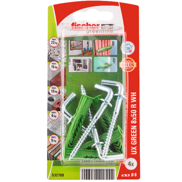 Dűbel "FISCHER UX GREEN" - 4db 8x50mm dűbel 4db kampóval - elő és átmenő szereléshez - feszítés, alakformálódás, csomósodás - alkalmazható: beton, tégla, gipszkarton, üreges födém, terméskő, forgácslap