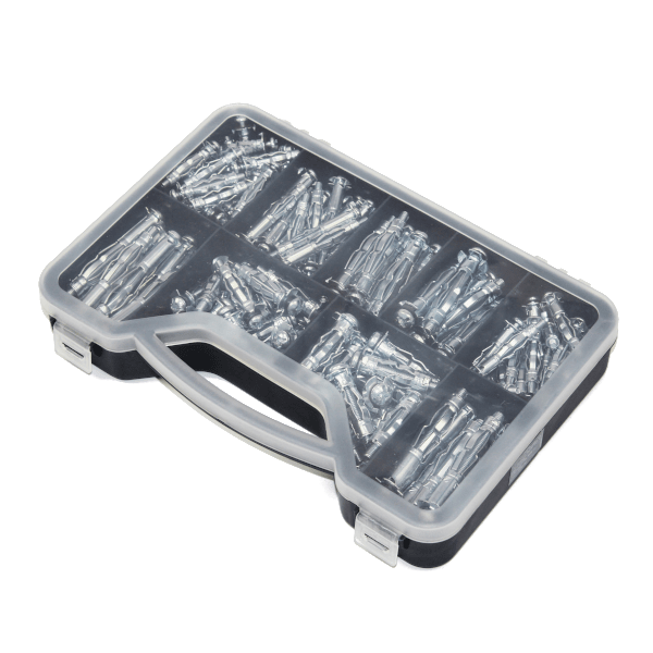 Fali rögzítő készlet, 141 részes. Műanyag tárolódobozban, átlátszó tetővel, 9 különböző méretű rögzítőelem: 28 db M4 x 32, 22 db M4 x 38, 20 db M4 x 46, 20 db M5 x 37, 10 db M5 x 52, 10 db M5 x 65, 15 db M6 x 37, 8 db M6 x 52, 8 db M6 x 65. Rögzítőelemek hossza: 32 - 65 mm, átmérő: 8 - 10 mm.