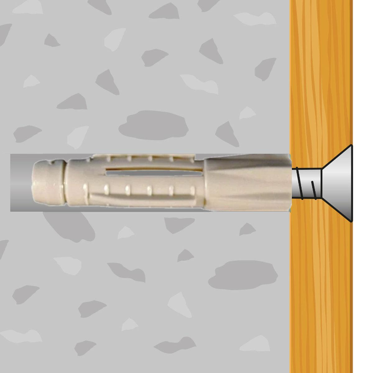 Beton és tégla szerkezetben rögzíthető. A megfelelő méretű furatba a tipli kalapáccsal enyhe ütéssel helyezhető be. Biztos csomóképződés minden üreges anyagban és erős terpesztés tömör építőanyagokban. Méret: 6x34mm.