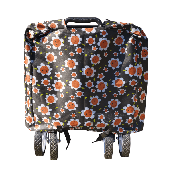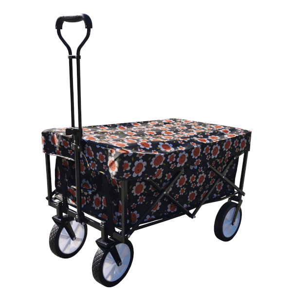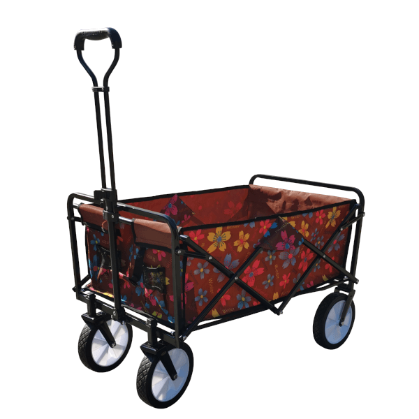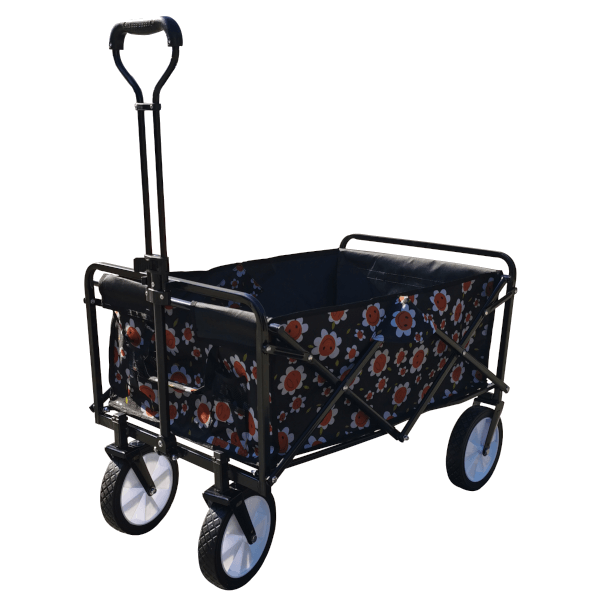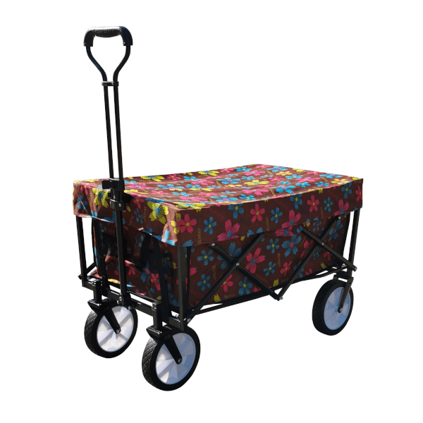 Az összecsukható kocsi alkalmas különböző tárgyak, eszközök mozgatására, emellett tökéletes társ kertészeti, hobbi és szabadidős tevékenységekhez. Főbb jellemzők: takaróponyvával védi a szállított holmikat az esőtől, néhány egyszerű lépéssel a kocsit össze lehet csukni, teleszkópos, párnázott fogantyújával kényelmes húzni, egyszerű kormányozni. Egyik végén két külső zseb/tartó található, pl. flakonok is kényelmesen elhelyezhetők benne. Műszaki adatok: teherbírás: 80kg, tároló mérete: kb 82x45x26cm, teljes mérete fogantyú nélkül: kb. 89,5x50,5x59,5cm, anyaga: fém és műanyag, kerekek mérete: 20cm. A termék elérhető nyári virágok és napraforgó színmintával.