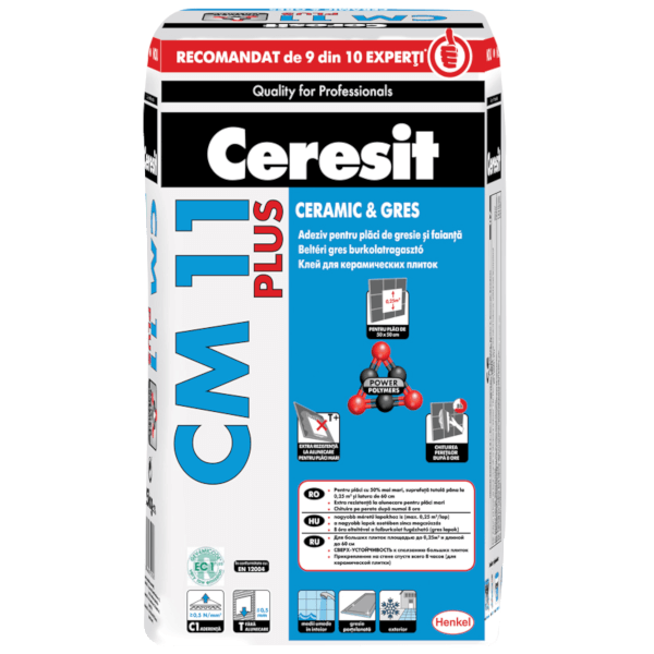 Ceresit CM 11 Plusz burkolatragasztó - 25 kg - metlachi-, anyagában színezett- és mázas burkolólapok, valamint hasított kőlapok ragasztására - kül- és beltérben - nem hőterhelt, nedvszívó felületre - felhordható 2-10 mm vastagságban - kőporcelán (gres) lapok ragasztására beltérben, nedvszívó felületre, hagyományos fűtés esetén alkalmas - a greslapok maximális mérete 40 x 40 cm lehet 6 mm vastagság esetén
